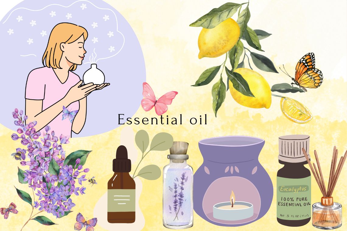 น้ำมันหอมระเหย: นอกจากให้กลิ่นหอมแล้ว น้ำมันหอมระเหยยังมีคุณสมบัติในการบำบัดร่างกายและจิตใจ ตัวอย่างเช่น น้ำมันหอมระเหยลาเวนเดอร์ (Lavender Essential Oil) ช่วยให้ผ่อนคลายและส่งเสริมการนอนหลับ หรือ น้ำมันหอมระเหยเปปเปอร์มินต์ (Peppermint Essential Oil) ที่ช่วยกระตุ้นพลังงานและบรรเทาอาการปวดหัว นอกจากนี้ น้ำมันหอมระเหยยังใช้ในการดูแลผิว เสริมสร้างสุขภาพ และช่วยปรับสมดุลอารมณ์